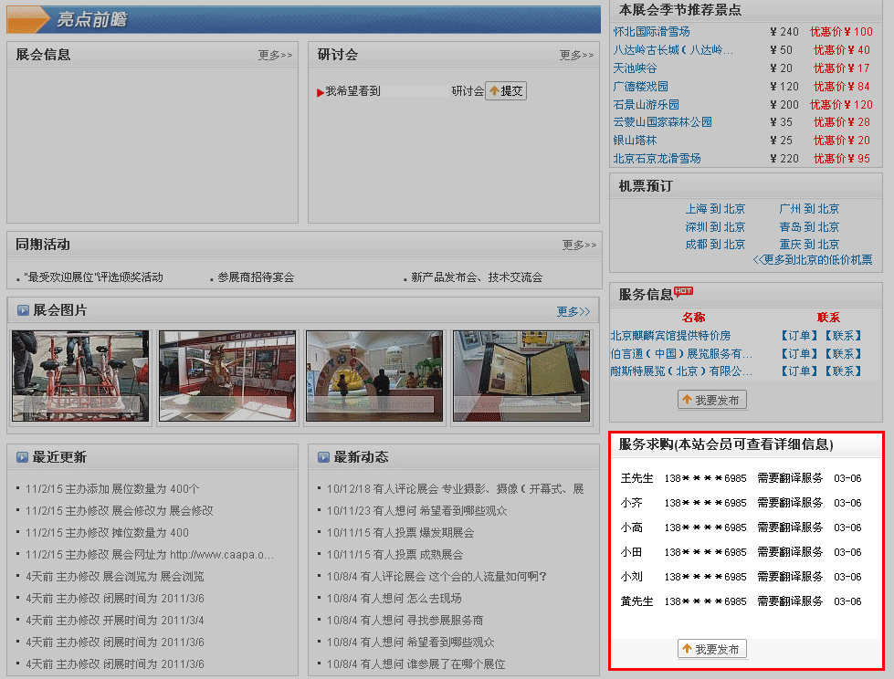 如果觀眾或展商需要搭建、運輸?shù)确?wù),他們可以發(fā)布服務(wù)需求,并在展覽會的右下部顯示出來,如下圖所示: