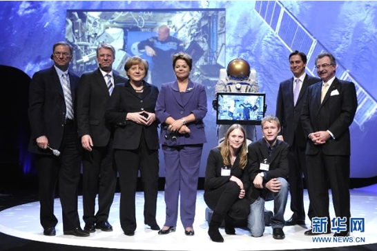 3月5日,在德國漢諾威,德國總理默克爾(左三)和巴西總統(tǒng)羅塞夫(左四)等在博覽會開幕式上參加與國際空間站宇航員現(xiàn)場連線的活動。當晚,世界上規(guī)模最大的IT展會之一——漢諾威信息及通信技術(shù)博覽會舉行開幕式,本屆博覽會將從3月6日持續(xù)到3月10日,伙伴國是巴西。
