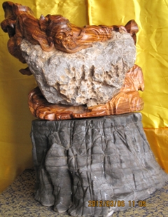 配之原作,不僅沒(méi)有喧賓奪主,相反底座與作品相得益彰,使作品更氣勢(shì)大度,使人似乎感悟到“收藏既是藝術(shù)品的集聚,更是精神財(cái)富的擁有”,另外《愚公移山》黃花梨根抱石配之以廣西幽蘭石的底座,更是難得一見(jiàn)的收藏精品,去年在展覽會(huì)榮獲第四屆“百慧杯”中國(guó)藝術(shù)家具“匠心神工”精華大賽工藝品類創(chuàng)意金獎(jiǎng)。