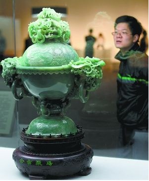 玉、牙雕藝術(shù)廳是所有展廳里人氣最旺的一個,只因為這里的“寶貝”最集中。既有象牙雕出的“劉海戲金蟾”、和田玉做成的“荷塘月色”,以及珊瑚制作的“龍行天下”和翡翠打造的“春江花月夜”。其中由中國工藝美術(shù)館收藏的國寶級翡翠玉雕“含香聚瑞”花薰成為此次雙年展的重頭戲。