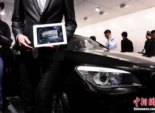 4月26日,2012(第十二屆)北京國際車展繼續(xù)舉行。在不少廠商展臺,導(dǎo)購人員或模特均手持iPad等平板電腦,作為向觀眾介紹車輛資料的新工具。(來源:中新網(wǎng))