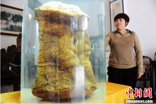 5月2日,湖南長沙烈士公園瀟湘奇石館內(nèi)一尊高76厘米、胸徑約106厘米、重52公斤的“太歲”吸引了市民的眼球。“太歲”的擁有者張淑君表示,這尊“太歲”是傳家之寶,需要千年才能長那么大,一直養(yǎng)在家里的一口大缸中,論個頭來說在全國都十分罕見。據(jù)悉,“太歲”又稱“肉靈芝”,十分稀有,是百藥中的上品。有典籍記載,“太歲”性平,苦,無毒,具有補(bǔ)脾潤肺,補(bǔ)腎益肝等價值。(來源:中新網(wǎng))