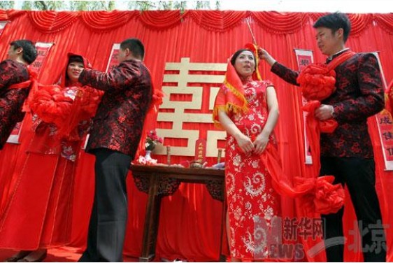 5月8日,一場(chǎng)按照北京民俗舉辦的中式集體婚禮在北海公園舉行,六對(duì)新人喜結(jié)良緣。此次婚禮揭開(kāi)了2012西城時(shí)尚婚慶文化博覽會(huì)的“蓋頭”。作為2012北京西單國(guó)際時(shí)尚節(jié)系列主題活動(dòng)之一,2012北京西城時(shí)尚婚慶文化博覽會(huì)于5月8日--13日在北海公園舉辦。(來(lái)源:新華網(wǎng))