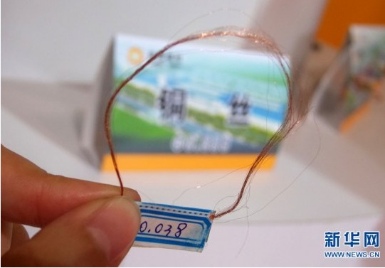 5月11日,記者在展會現(xiàn)場看到的山東某展商帶來的直徑為0.038mm的雙零線,這種銅絲廣泛用于手機(jī)震動器和軍工產(chǎn)品,其直徑比頭發(fā)絲還細(xì)。(來源:新華網(wǎng))