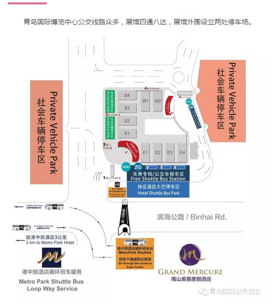 青島國際博覽中心公交線路眾多,展館四通八達,展館外圍設立兩處停車場。
