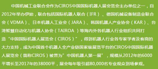 一大亮點(diǎn)是大會(huì)聯(lián)合全球四大機(jī)器人展之一,最早最專業(yè)展覽——中國(guó)國(guó)際機(jī)器人展覽會(huì)同時(shí)同場(chǎng),展覽總面積達(dá)56000平米,全世界參觀人數(shù)預(yù)計(jì)將超過(guò)100000人,將打造中國(guó)最具規(guī)模和最具影響力的首屈一指的全球無(wú)人系統(tǒng)盛會(huì)。
