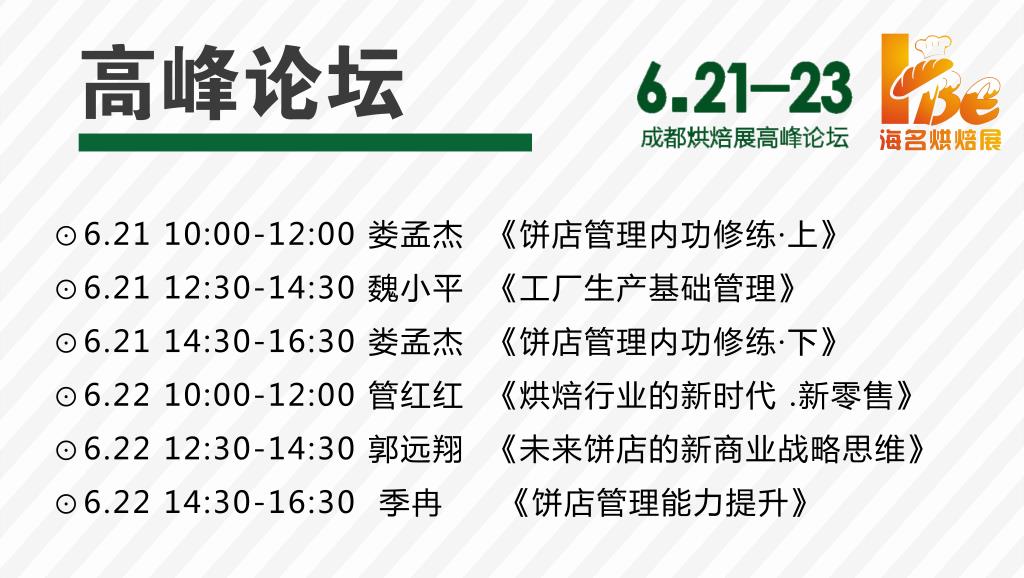 2018年第十三屆成都烘焙展急你所急,想你所想。6月21-23日成都世紀(jì)城新國(guó)際會(huì)展中心,主題烘焙論壇專(zhuān)為烘焙從業(yè)者量身打造,烘焙行業(yè)問(wèn)題全解讀,提前預(yù)約就可獲取現(xiàn)場(chǎng)免費(fèi)席位。在第十三屆成都烘焙展的現(xiàn)場(chǎng),來(lái)自烘焙先鋒的行業(yè)金牌導(dǎo)師郭遠(yuǎn)翔、管紅紅在現(xiàn)場(chǎng)針對(duì)餅店發(fā)展,業(yè)績(jī)提升為您解答。更有來(lái)自博尊烘焙的行業(yè)大咖導(dǎo)師婁孟杰老師、駐店指導(dǎo)老師季冉老師、生產(chǎn)管理老師魏小平老師都會(huì)齊聚,在現(xiàn)場(chǎng)可以就公司發(fā)展、門(mén)店管理、生產(chǎn)管理等各方面為您一站式解答。