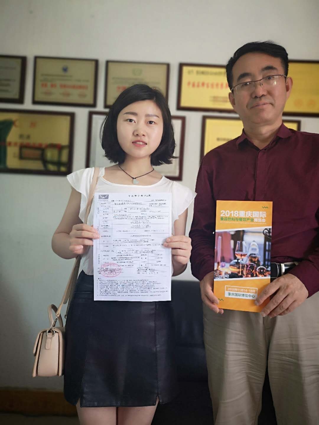 餐博會組委會工作人員楊珊(左)與重慶鵬通食品機(jī)械浦總(右)簽單合影