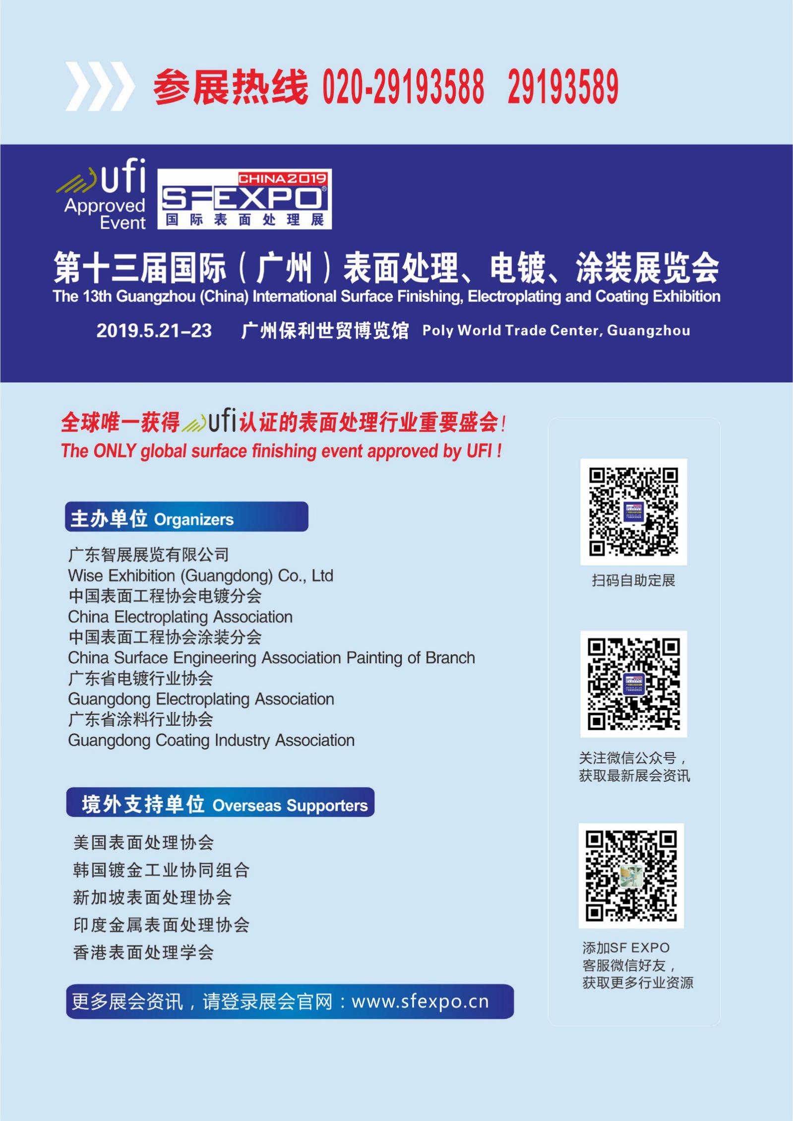 而作為深耕珠三角地區(qū)十多載的國際(廣州)表面處理 電鍍 涂裝展覽是國內(nèi)最專業(yè),發(fā)展最迅速的表面處理專業(yè)展覽會,一直以來都受到行業(yè)人士的認可及推崇!2019第十三屆國際(廣州)表面處理 電鍍 涂裝展覽會,2019年5月21-23日,廣州保利世貿(mào)博覽館,我們再次相約,共聚行業(yè)盛會!
