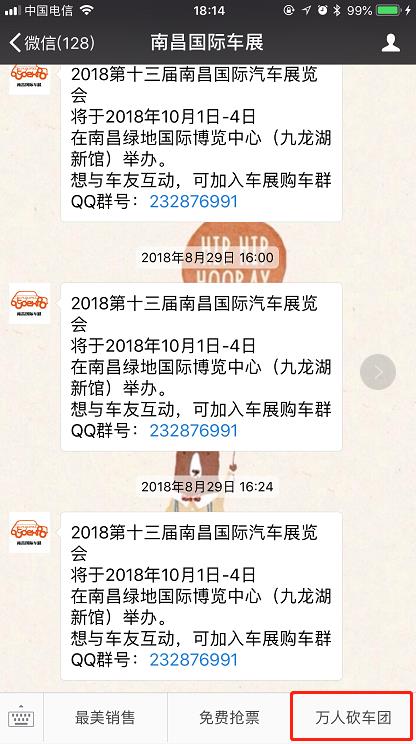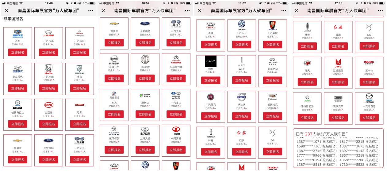 1、即日起至9月30日,通過微信關(guān)注“南昌國際車展”,點擊【萬人砍車團】按鈕進入專題,選擇喜歡的汽車品牌即可免費報名參加“南昌國際車展官方萬人砍車團”活動(每人限報一個砍車團);