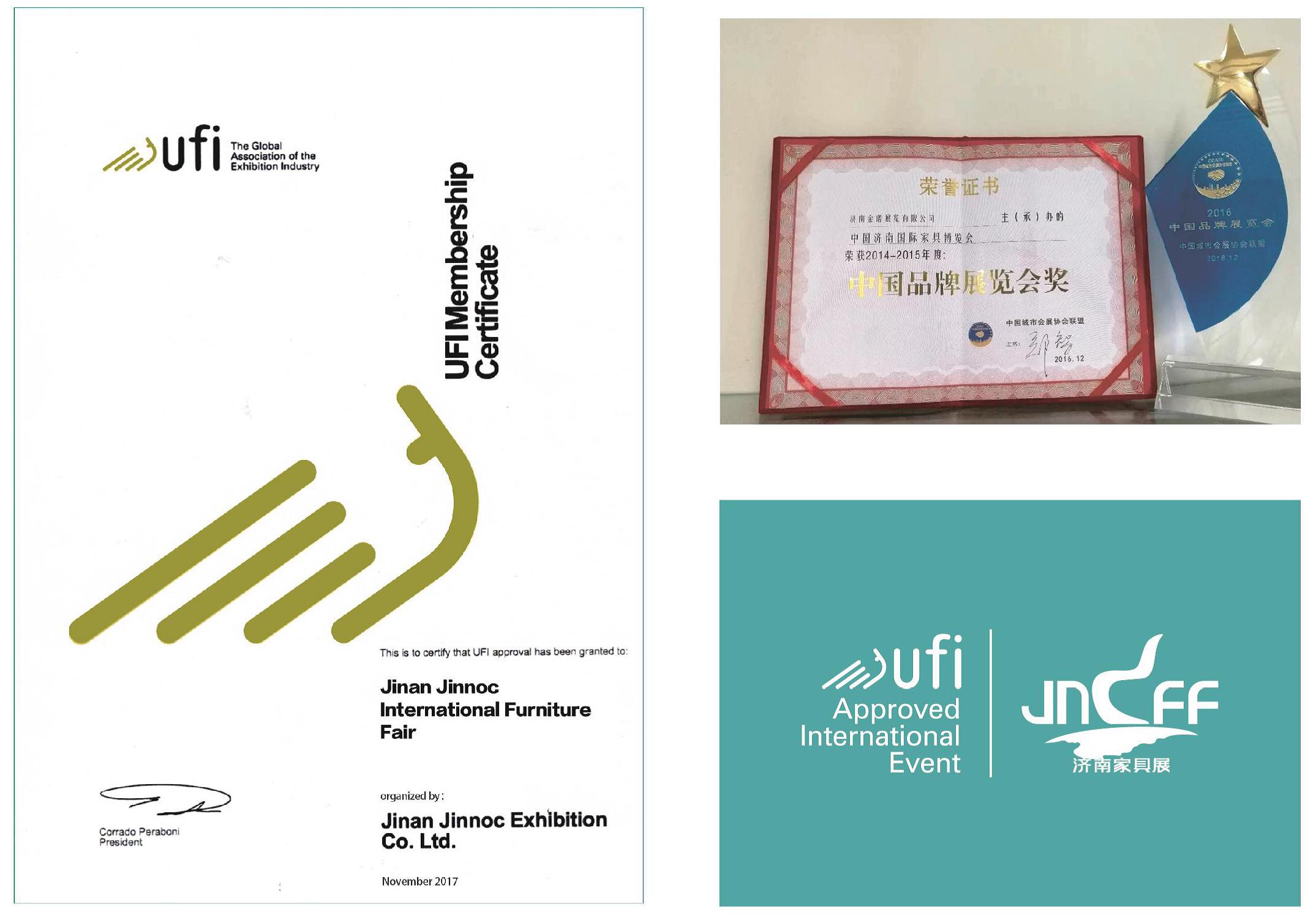 “濟(jì)南國際家具博覽會”于2016年在中國(重慶)城市會展業(yè)合作發(fā)展論壇暨2016中國城市會展協(xié)會聯(lián)盟峰會上榮膺“2016中國品牌展覽會”殊榮。2017年11月1日,在第84屆國際展覽業(yè)協(xié)會年會上通過了全球國際展覽業(yè)協(xié)會執(zhí)行委員會的審核,成為了UFI的正式會員,“濟(jì)南國際家具博覽會”被授予 “UFI認(rèn)證的國際展覽會”。 “濟(jì)南國際家具博覽會”獲得UFI認(rèn)證在展會發(fā)展歷程上具有里程碑意義,這是山東省內(nèi)第一個獲得UFI認(rèn)證的家具類專業(yè)展會。