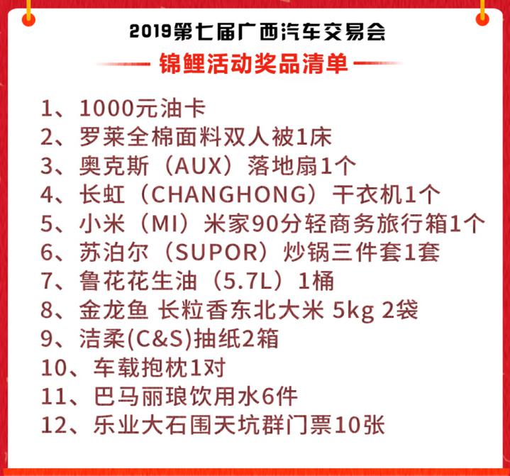 為了回饋廣大市民朋友對本屆廣西車交會(huì)的支持,車展組委會(huì)特別推出免費(fèi)觀展搶錦鯉大禮包活動(dòng),凡是在3月14日中午12:00前報(bào)名觀展的用戶,均可參與抽獎(jiǎng)。而在開展首日(3月15日12:00),車展最強(qiáng)錦鯉即將誕生,好玩、福利、優(yōu)惠看得見。到底誰能獨(dú)攬禮品清單中的12種好禮,讓我們拭目以待。