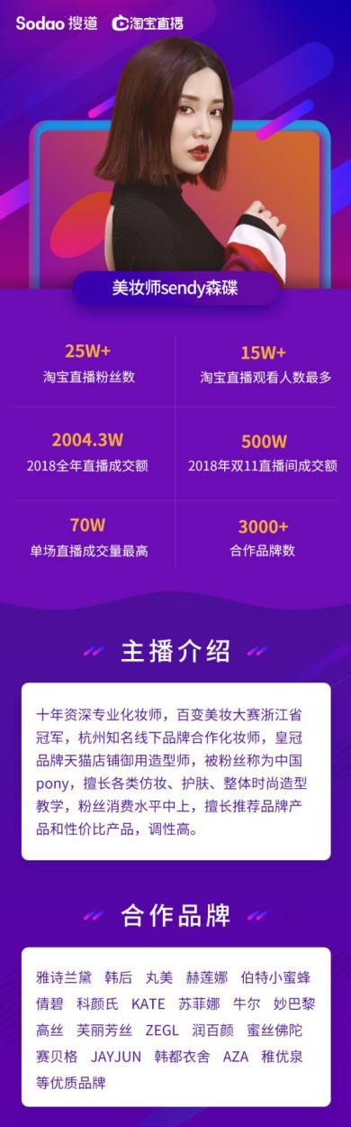 提及搜道,這是一家第一批入駐淘寶直播的機(jī)構(gòu),自直播上線來(lái),穩(wěn)居淘寶直播top機(jī)構(gòu)席位,旗下簽約主播達(dá)50余名,合作達(dá)人百余位,其中打造培養(yǎng)出首席百萬(wàn)級(jí)粉絲柔柔家柔柔、30W+粉絲、20W+粉絲主播近二十位,主播類(lèi)目已涵蓋美妝、母嬰、美食、運(yùn)動(dòng)健身等不同范疇。 2018年旗下主播帶動(dòng)銷(xiāo)售超百萬(wàn)筆,總銷(xiāo)售額突破一億大關(guān);整體數(shù)據(jù)名列五百家淘寶直播機(jī)構(gòu)前十。