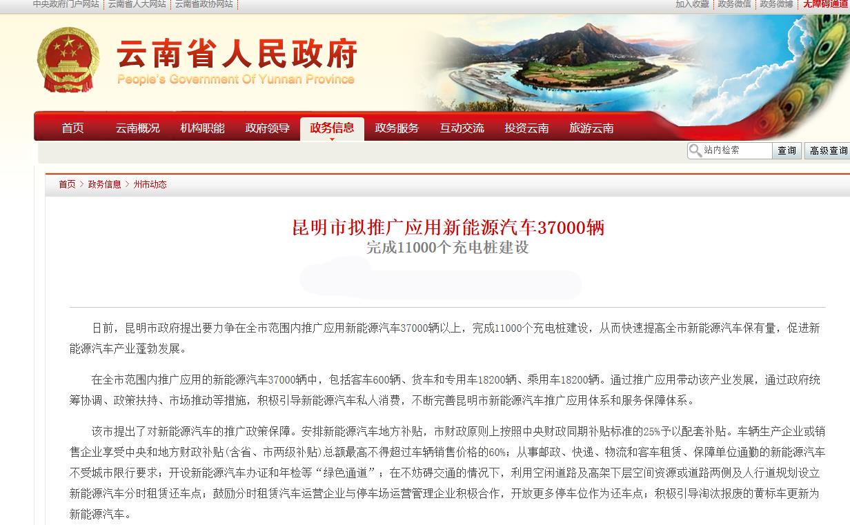 日前,昆明市政府提出要力爭在全市范圍內(nèi)推廣應(yīng)用新能源汽車37000輛,其中包括客車600輛、貨車和專用車18200輛、乘用車18200輛,11000個充電樁建設(shè),從而快速提高全市新能源汽車保有量,促進新能源汽車產(chǎn)業(yè)蓬勃發(fā)展。并推出了一系列對新能源汽車的推廣的利好政策: