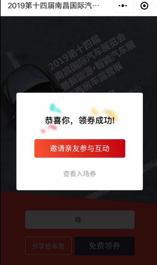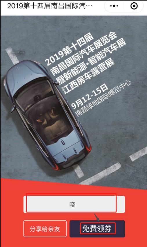 1、識別圖中“南昌國際車展”小程序碼,輸入昵稱點(diǎn)擊“免費(fèi)搶券”允許小程序授權(quán)微信;