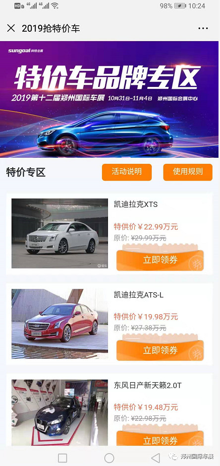 ◆關(guān)注【鄭州國際車展】官方微信,選擇【車展活動(dòng)】菜單,點(diǎn)擊【5折搶特價(jià)車】,即可參與搶特價(jià)車活動(dòng),選擇意向特價(jià)車型,獲得專屬搶特價(jià)車資格券,保存券號(hào),車展期間隨機(jī)抽取,成為準(zhǔn)車主。