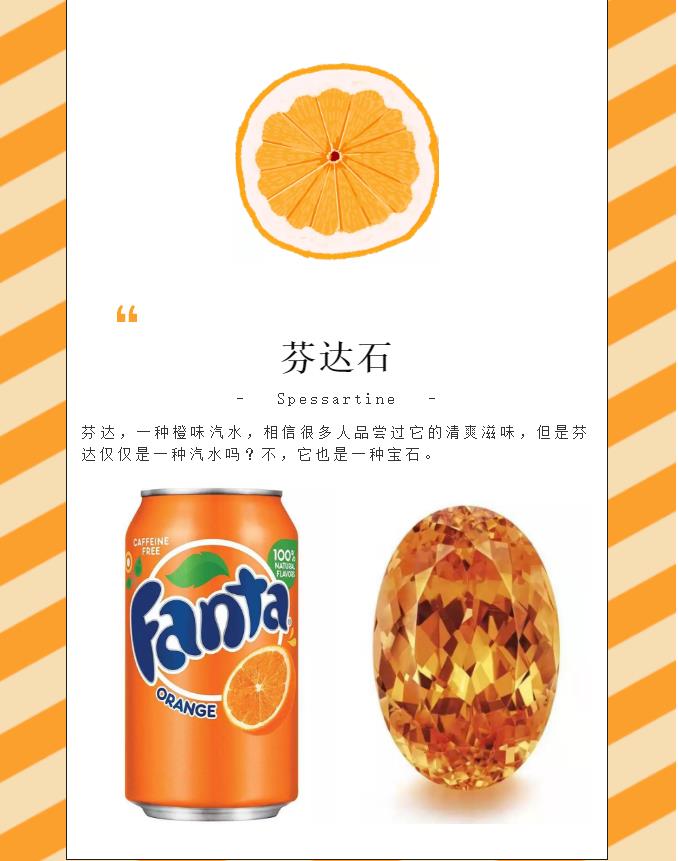 后來經(jīng)研究鑒定,發(fā)現(xiàn)這其實(shí)是一種含錳鋁元素的石榴石,任何用化學(xué)、地理或顏色來命名的方法,顯然不足以形容它明艷燦爛的顏色。最后,一種代表快樂趣味的橙味汽水名字被它成功借用——Fanta,芬達(dá)之于芬達(dá)石,堪稱天作之合。