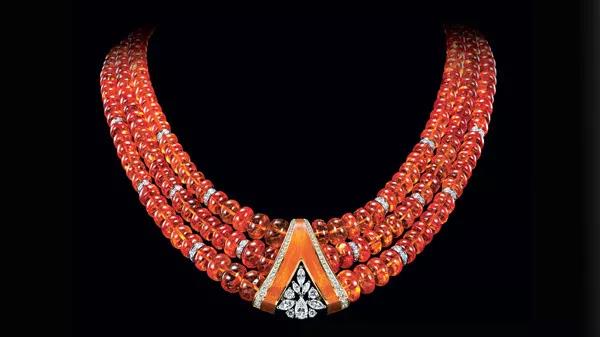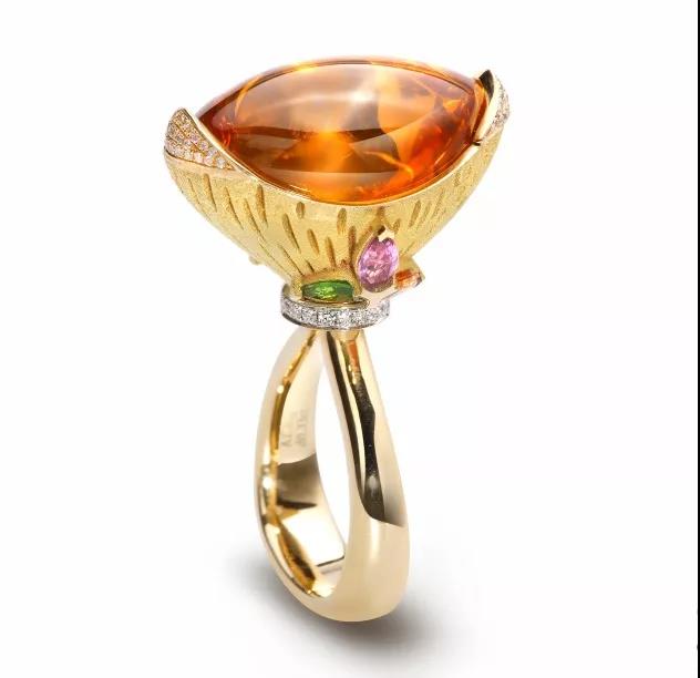 芬達(dá)石的致色元素是鐵和錳,決定它能夠呈現(xiàn)出猶如芬達(dá)般純凈鮮艷而又明亮的橙色,使得它在歐美市場(chǎng)受到熱烈歡迎。不少知名的珠寶品牌,如今都開始采用優(yōu)質(zhì)的芬達(dá)石作為創(chuàng)作靈感,設(shè)計(jì)了一系列夢(mèng)幻的珠寶作品。