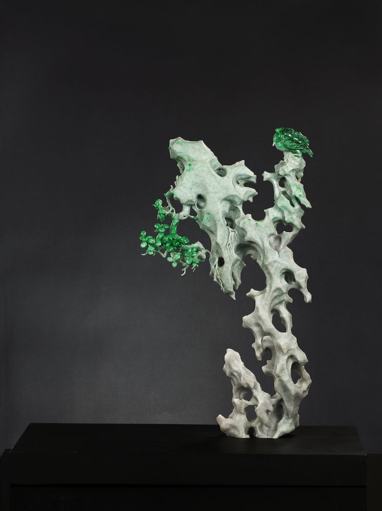 以《一樹清風》為例看玉雕大師如何俏色巧用,作品原料為翡翠,顏色主要以不同色調的綠色為主,作品選材自然主題,巧用原料中的深綠色部分做樹木及臥鳥,其余部分做怪石狀。著重刻畫樹葉、根莖、羽毛、怪石走向等細節(jié),用顏色濃淡表現前后關系,凸顯立體感和真實感,以刻刀為筆,“繪制”出一副頗具國風的工筆畫。