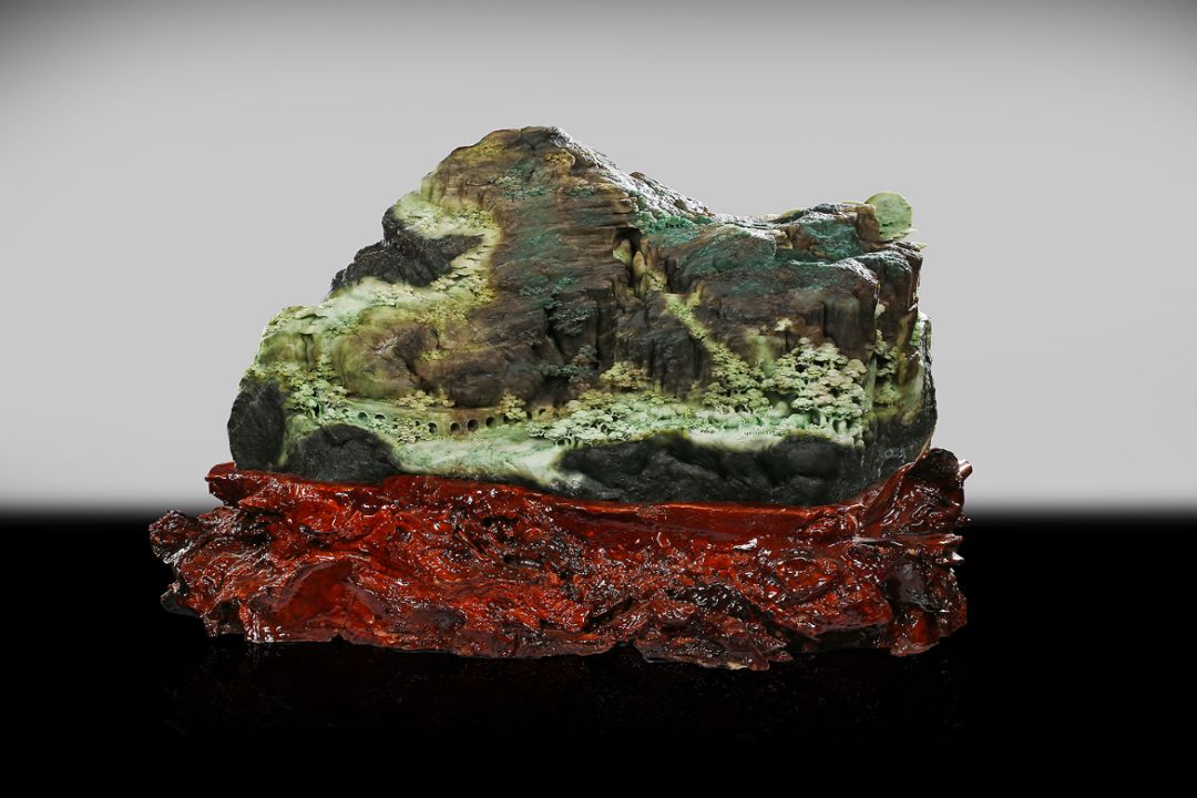 作品《巍巍太行》材質為獨山玉,作品靈感源于自然山林。此原料為雜色獨山玉,綠、白、褐、青等顏色相互呈浸染狀或漸變過渡狀存在于同一塊體上,其塊度大,形狀似山峰。作者以此為基礎,用巧奪天工的高超技藝雕刻出太行山勝景。借用中國山水畫中散點透視,高遠、深遠、平遠的“三遠”表現手法,巧用顏色體現前后關系以及畫面立體感。近處的樹林、橋梁、牛群、流水;遠處的庭閣、房屋、小路、云彩,以淺色表現,比例適當、線條流暢、細節(jié)處理到位傳神,能抓住觀者第一視角。以褐、棕色表現山脈,突顯山脈的陡峭層疊、莊重巍峨之感,太行山的大氣磅礴與山中生活意境之美完美呈現。