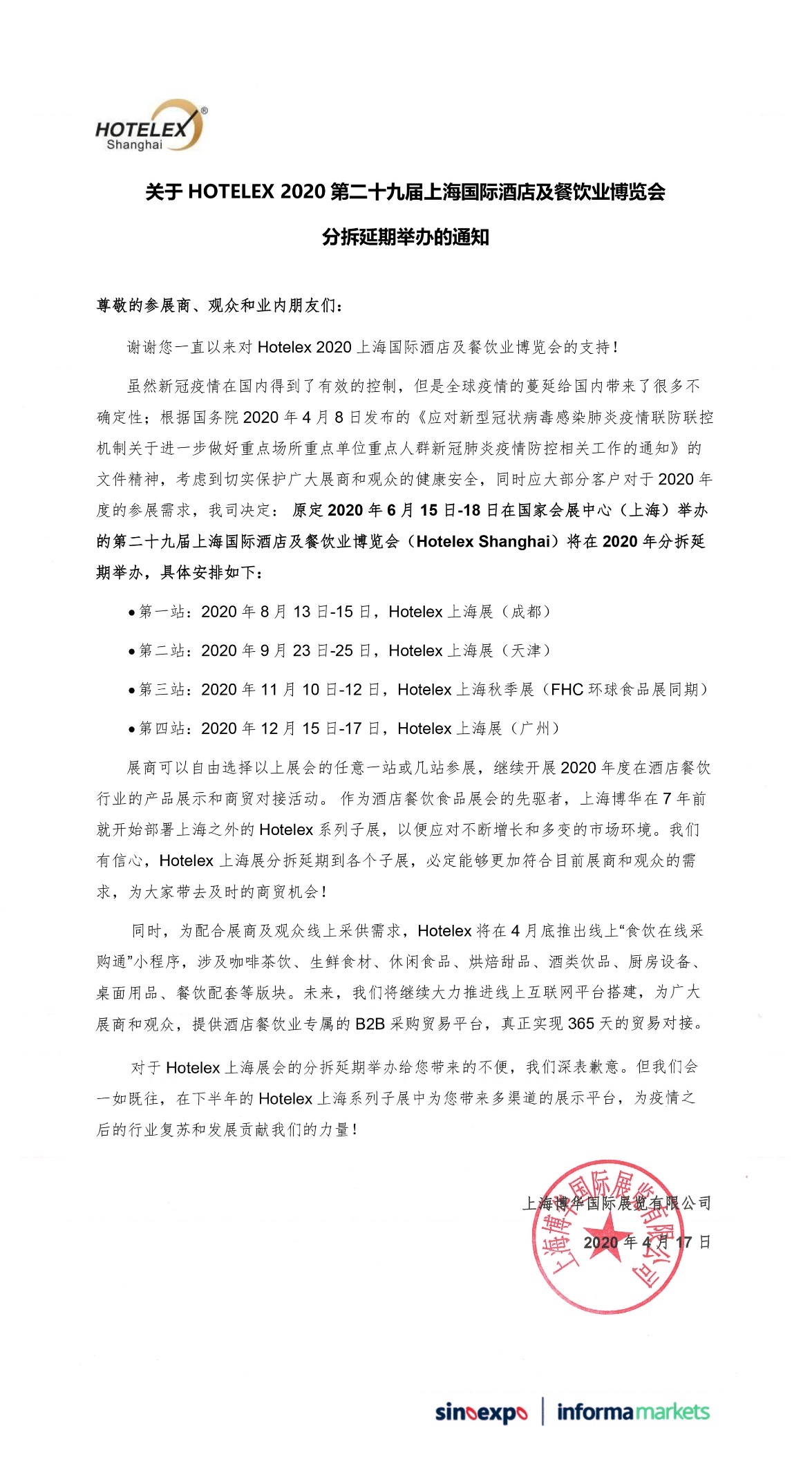 第二十九屆上海國際酒店及餐飲業(yè)博覽會(huì)分拆延期通知