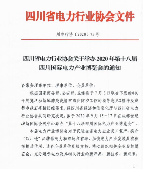 四川省電力行業(yè)協(xié)會(huì)關(guān)于舉辦2020年第十八屆四川國(guó)際電力產(chǎn)業(yè)博覽會(huì)的通知