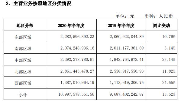 分區(qū)域來(lái)看,北部區(qū)域營(yíng)收28.61億元,同比增長(zhǎng)11.82%,營(yíng)收最多;其次分別為中部、東部、南部、西部區(qū)域,營(yíng)收分別為23.92億元、22.83億元、20.74億元、13.87億元,同比增幅分別為23.14%、10.76%、3.14%、24.55%,西部區(qū)域營(yíng)收增長(zhǎng)最快。除南部區(qū)域外,其余4大區(qū)域營(yíng)收均實(shí)現(xiàn)了雙位數(shù)增長(zhǎng)。