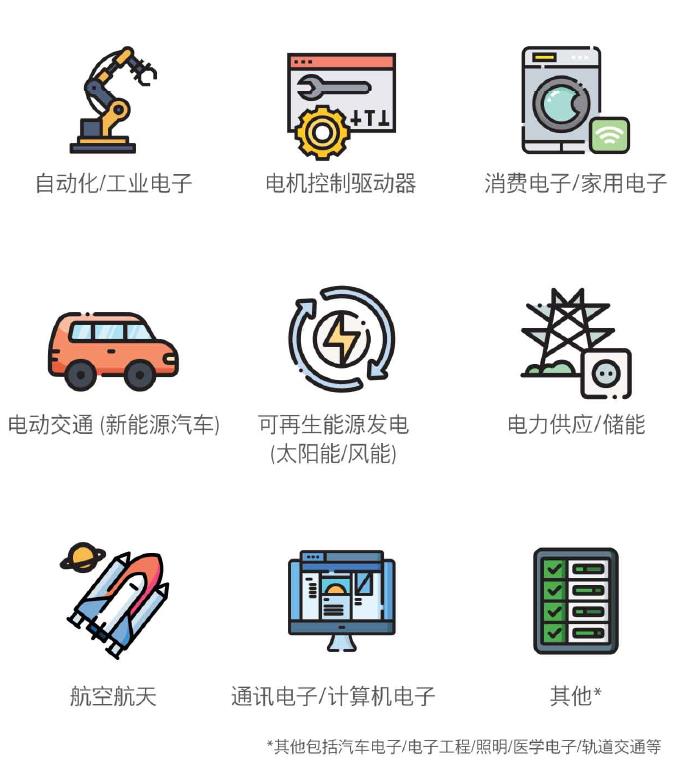 功率半導體元件及模塊、集成電路、無源元件、電磁及磁性材料、散熱管理、傳感器、裝配和子系統(tǒng)、電氣傳動、功率轉(zhuǎn)換器、電能質(zhì)量&儲能、測試&測量、軟件開發(fā)、信息及服務(wù)