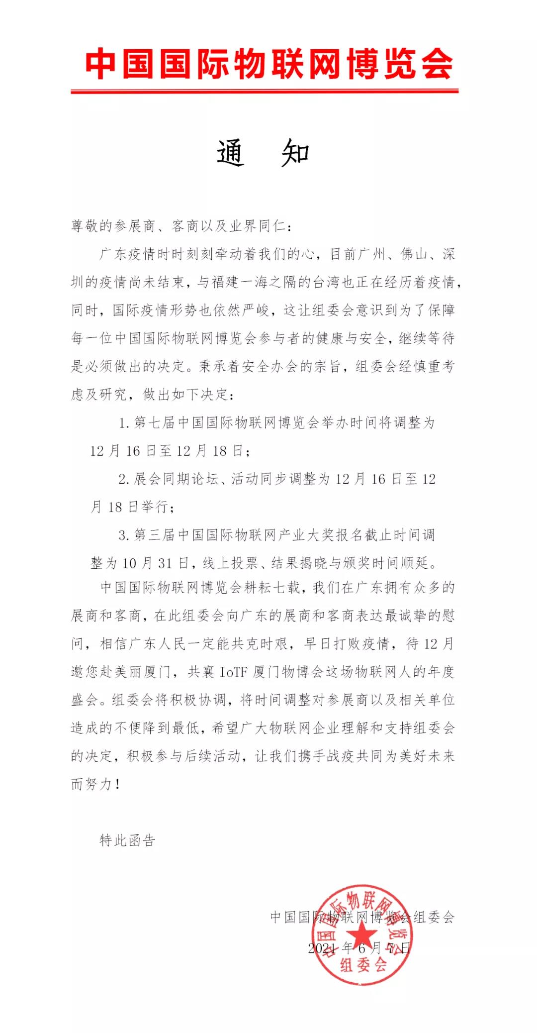 廣東的疫情時(shí)時(shí)刻刻牽動(dòng)著我們的心,目前廣州、佛山、深圳的疫情尚未結(jié)束,與福建一海之隔的臺(tái)灣也正在經(jīng)歷著疫情,同時(shí),國(guó)際疫情也依然嚴(yán)峻,這讓組委會(huì)意識(shí)到為了保障每一位中國(guó)國(guó)際物聯(lián)網(wǎng)博覽會(huì)參與者的健康與安全,繼續(xù)等待是必須做出的決定,綜合當(dāng)前形勢(shì),組委會(huì)作出以下決定:
