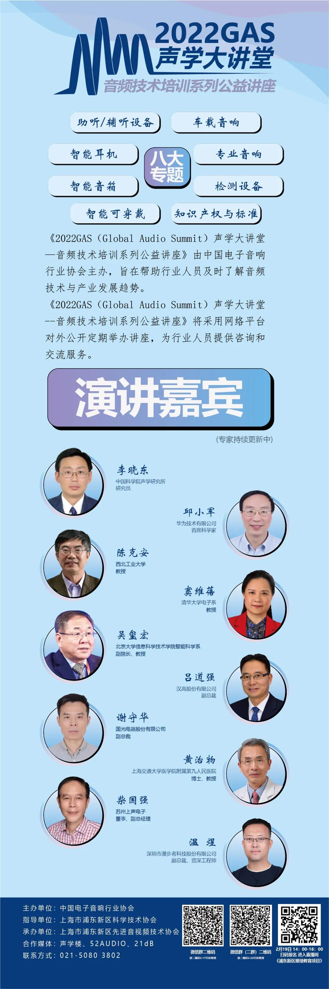 聲學(xué)大講堂——音頻技術(shù)培訓(xùn)系列公益講座由中國(guó)電子音響行業(yè)協(xié)會(huì)主辦,協(xié)會(huì)邀請(qǐng)國(guó)內(nèi)外聲學(xué)專家,基于互聯(lián)網(wǎng)平臺(tái),實(shí)現(xiàn)隨時(shí)隨地互動(dòng)學(xué)習(xí),旨在幫助行業(yè)人員及時(shí)了解音頻技術(shù)與產(chǎn)業(yè)發(fā)展趨勢(shì)。