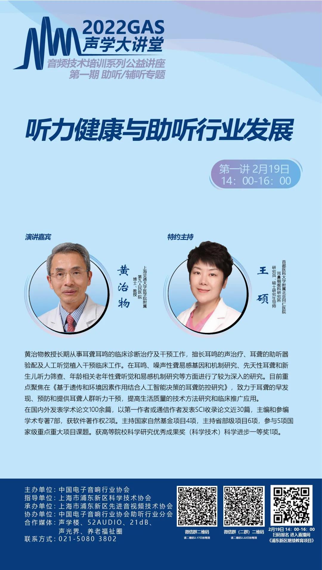 2022年2月19日下午2點(diǎn),協(xié)會(huì)將正式舉辦《2022GAS聲學(xué)大講堂—音頻技術(shù)培訓(xùn)系列公益講座》啟動(dòng)大會(huì),來自上海交通大學(xué)醫(yī)學(xué)院附屬第九人民醫(yī)院的黃治物教授為大家分享《聽力健康與助聽行業(yè)發(fā)展》。