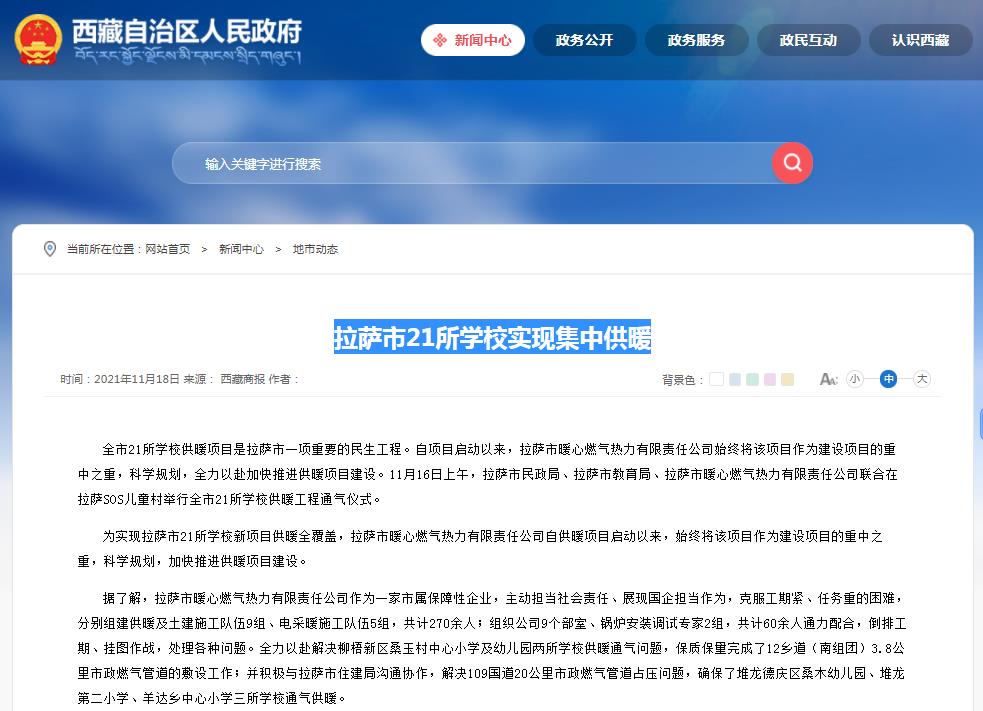 11月16日上午,西藏拉薩市民政局、拉薩市教育局、拉薩市暖心燃?xì)鉄崃τ邢挢?zé)任公司聯(lián)合在拉薩SOS兒童村舉行全市21所學(xué)校供暖工程通氣儀式。截至目前,由拉薩市暖心燃?xì)鉄崃τ邢挢?zé)任公司承建的城關(guān)區(qū)11所學(xué)校、堆龍德慶區(qū)6所學(xué)校、柳梧新區(qū)3所學(xué)校和拉薩SOS兒童村,共計(jì)21所學(xué)校全部按期完成庭院燃?xì)夤艿?、供暖管道及戶?nèi)供暖設(shè)施設(shè)備的安裝,并已實(shí)現(xiàn)供暖點(diǎn)火。其中,16所學(xué)校為氣供暖,5所學(xué)校為電供暖,集中氣供暖時(shí)間與全市其他學(xué)校同步,從11月15日至次年3月15日。