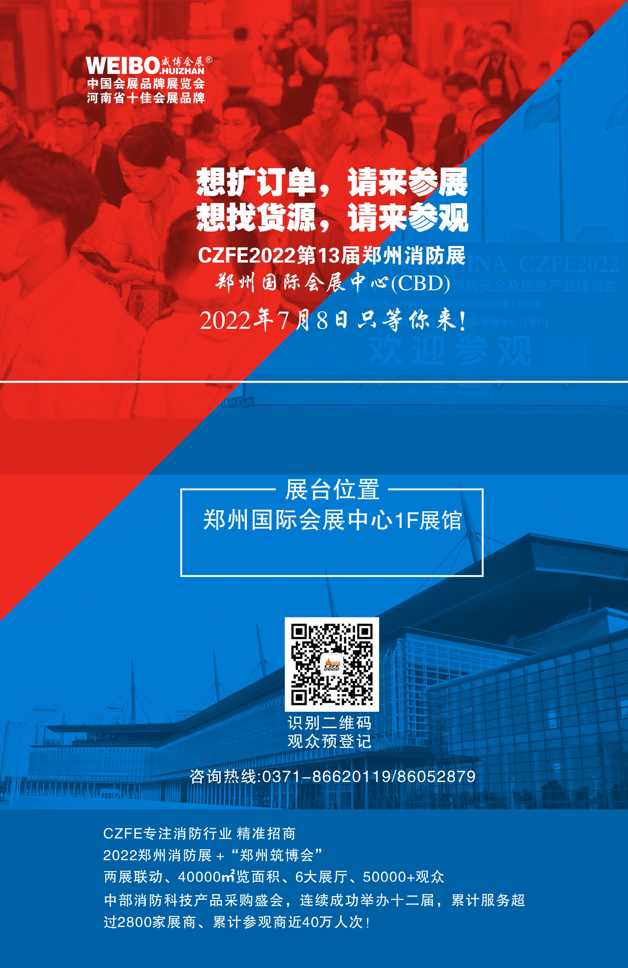 2022年第13屆鄭州國際消防展與2022年中國.鄭州建筑博覽會同期上演,六大展廳、1000+展商、40000㎡展覽面積、50000+觀眾,展覽規(guī)模全面升級,廣大意向參展企業(yè),如您有計劃參加CZFE鄭州國際消防展,請盡快與組委會工作人員取得聯(lián)系,或通過大會官方網(wǎng)站/官方微信在線報名,收到報名后我們將盡快與您聯(lián)系。為避免使您的人力物力財力受到損害,請您認準大會唯一官方報名渠道。