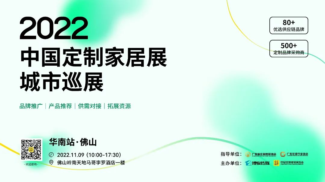 由廣東省定制家居協(xié)會、廣東衣柜行業(yè)協(xié)會指導,中國廣州/成都定制家居展、博駿傳媒聯(lián)合全國各地商協(xié)會主辦的“2022中國定制家居展·城市巡展”,將于11月9日首次落地華南站在佛山·嶺南天地馬哥孛羅酒店舉行,本次巡展將以粵港澳大灣區(qū)為中心,輻射廣州、佛山、深圳、東莞、中山等中心城市。