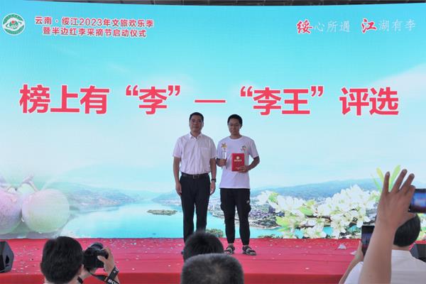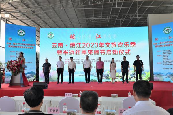 活動(dòng)現(xiàn)場(chǎng),綏江縣委常委、縣委辦主任邱崠秦同志為啟動(dòng)儀式致詞,縣人民政府副縣長(zhǎng)丁永帥同志進(jìn)行現(xiàn)場(chǎng)推介,縣委書記蘇世攀同志宣布活動(dòng)啟動(dòng),并在與會(huì)嘉賓陣陣熱烈的掌聲中,舉行了云南·綏江2023文旅歡樂(lè)季暨半邊紅李采摘節(jié)現(xiàn)場(chǎng)視頻啟動(dòng)儀式。