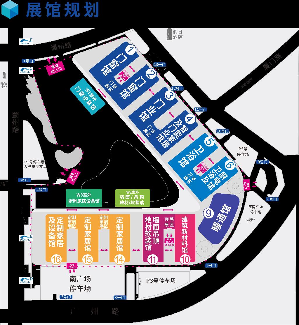 展會規(guī)模再度升級,展覽面積擴增至160000㎡,其中包含12個展館 +6個連接館+2個室外館展示。1、2、 3、4號為門窗館及智能家居展區(qū);5、6號為衛(wèi)浴館及廚電展區(qū);9號為