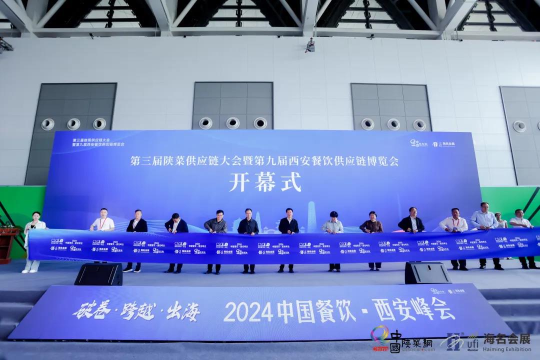 陜西省商務(wù)廳副廳長(zhǎng)郭紹敏;陜西省三秦文化研究會(huì)會(huì)長(zhǎng)張社年;西安市商務(wù)局一級(jí)調(diào)研員陸晴;陜西省三秦文化研究會(huì)副會(huì)長(zhǎng)、陜西金控集團(tuán)原董事長(zhǎng)權(quán)永生;陜西省三秦文化研究會(huì)副會(huì)長(zhǎng)王宏;陜西省三秦文化研究會(huì)副會(huì)長(zhǎng)、陜西旅游集團(tuán)總經(jīng)理任公正;重慶市小面協(xié)會(huì)會(huì)長(zhǎng)張壽江;蘭州烹飪協(xié)會(huì)會(huì)長(zhǎng)趙順謙;陜味食族油潑面創(chuàng)始人陳雷;深圳老碗會(huì)創(chuàng)始人楊富強(qiáng);陜西省餐飲聯(lián)合會(huì)駐會(huì)會(huì)長(zhǎng)黨小兵;西安飯店與餐飲行業(yè)協(xié)會(huì)會(huì)長(zhǎng)王小唐共同剪彩,第三屆陜菜供應(yīng)鏈大會(huì)暨海明·2024第9屆西安餐飲供應(yīng)鏈博覽會(huì)正式啟動(dòng)。