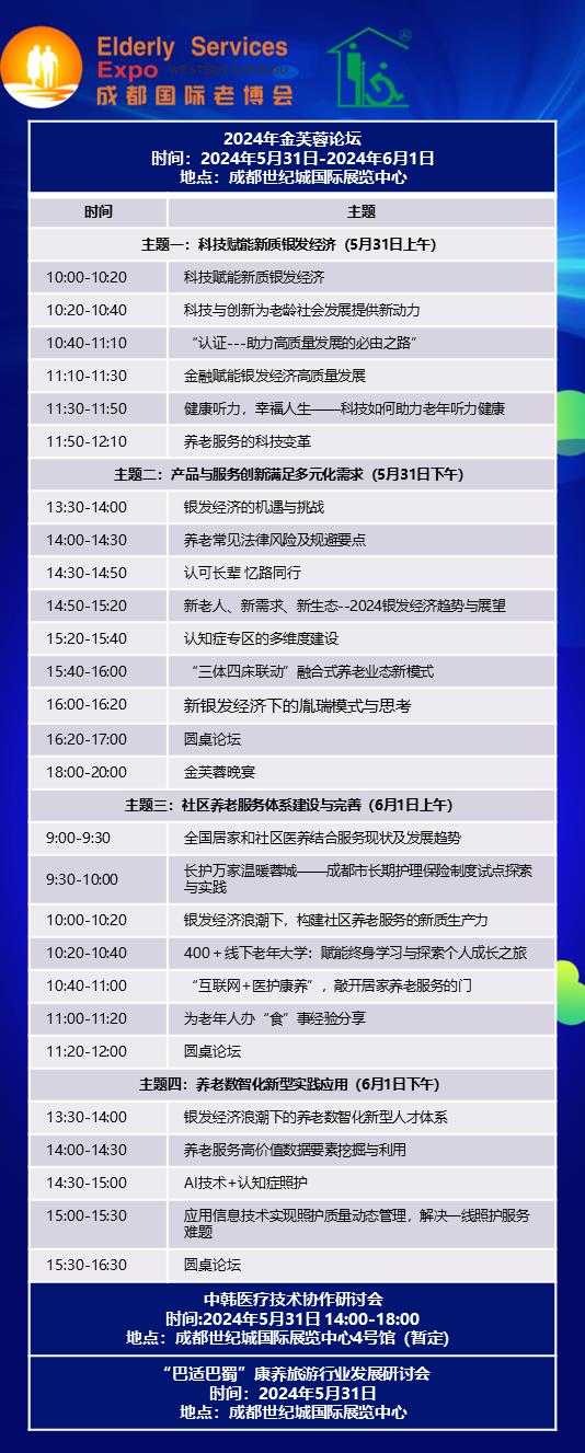 主論壇為2024金芙蓉養(yǎng)老論壇,論壇以“深耕銀發(fā)市場(chǎng),力促享老騰飛”為主題。從政府、市場(chǎng)、社會(huì)及家庭四個(gè)層面,圍繞科技賦能、社區(qū)養(yǎng)老、養(yǎng)老數(shù)字化等社會(huì)關(guān)注的熱門(mén)話題,進(jìn)行深入討論,助力享老服務(wù)邁向更高的臺(tái)階。此外,還將召開(kāi)中韓醫(yī)療技術(shù)協(xié)作研討會(huì)以及“巴適巴蜀”康養(yǎng)旅游行業(yè)發(fā)展研討會(huì),邀請(qǐng)展商和觀眾共同參與!